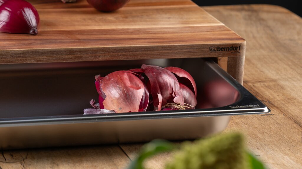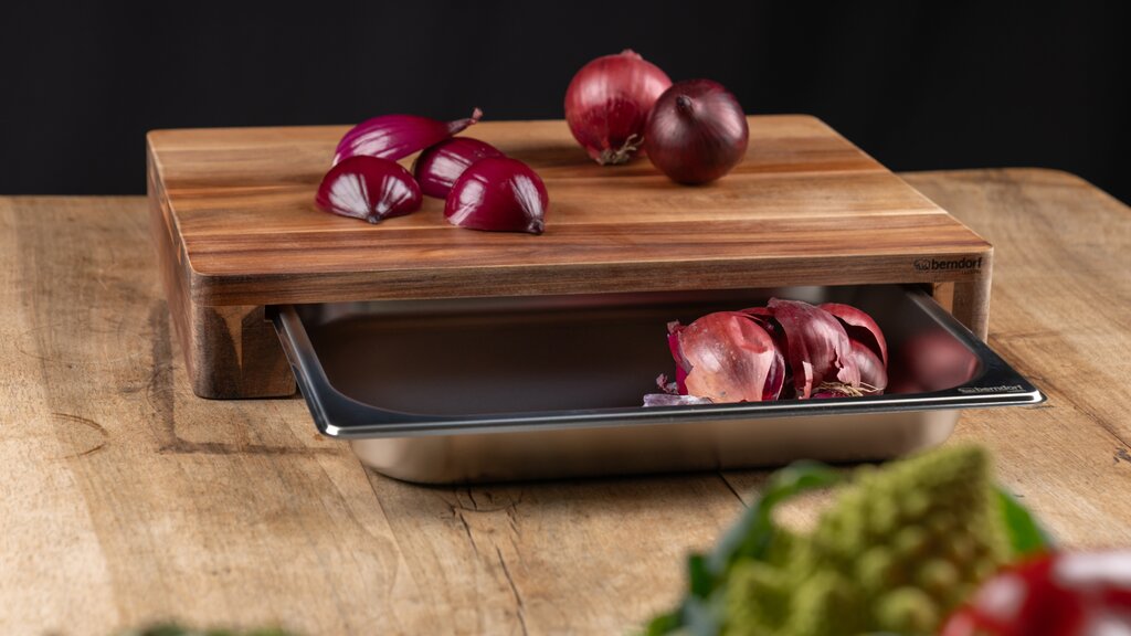 Dieses hochwertige Schneidebrett überzeugt nicht nur durch seine Funktionalität, sondern auch durch seine edle Optik. Gefertigt aus robustem Akazienholz besticht es mit einer natürlichen Maserung, die jedes Stück zu einem Unikat macht. Die Oberfläche ist mit einem lebensmittelechten Öl veredelt, das das Holz schützt und seine warme Ausstrahlung unterstreicht. Besonders praktisch ist die integrierte GN 1/2 Schublade aus Edelstahl, die sich nach vorne ausziehen lässt und nach hinten sicher arretiert ist – ideal zum Auffangen von Schnittgut oder Küchenabfällen. Für zusätzliche Stabilität sorgen Antirutsch-Füsschen, die ein sicheres Arbeiten ermöglichen.