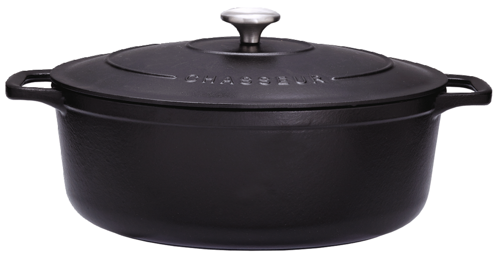 Gusseisen, schwarz matt, mit auswechselbaren Deckelgriffen: 1 Messinggriff und 1 Edelstahlgriff speziell für den Backofen