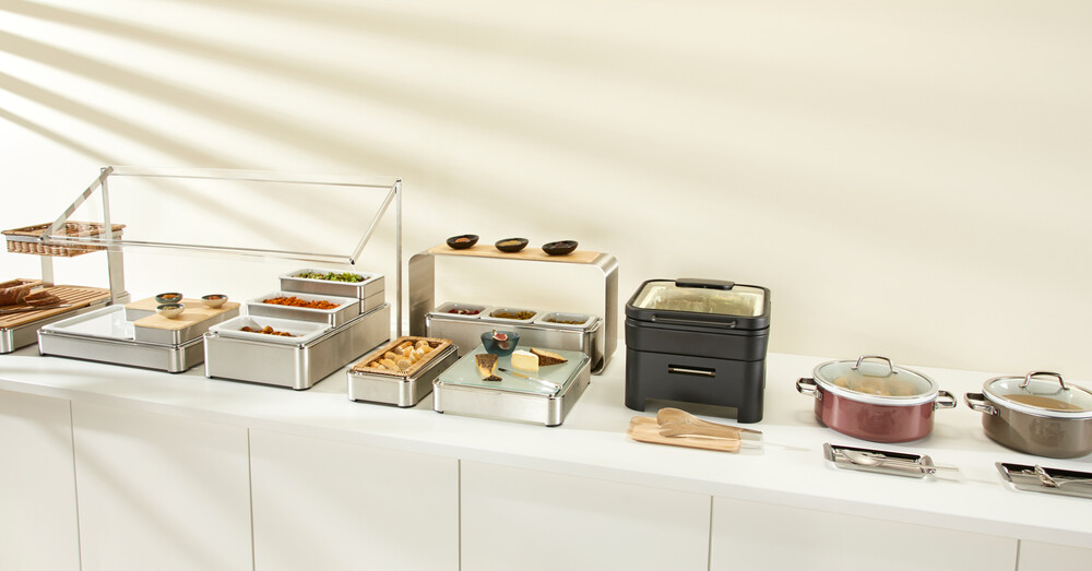 Die Serie Basic von WMF bietet elegante und praktische Chafing Dishes sowie Milch-, Saft- und Cerealien-Dispenser, Kaffee-Urnen für den täglichen Einsatz am Buffet und stilvolle Wasserkaraffen.