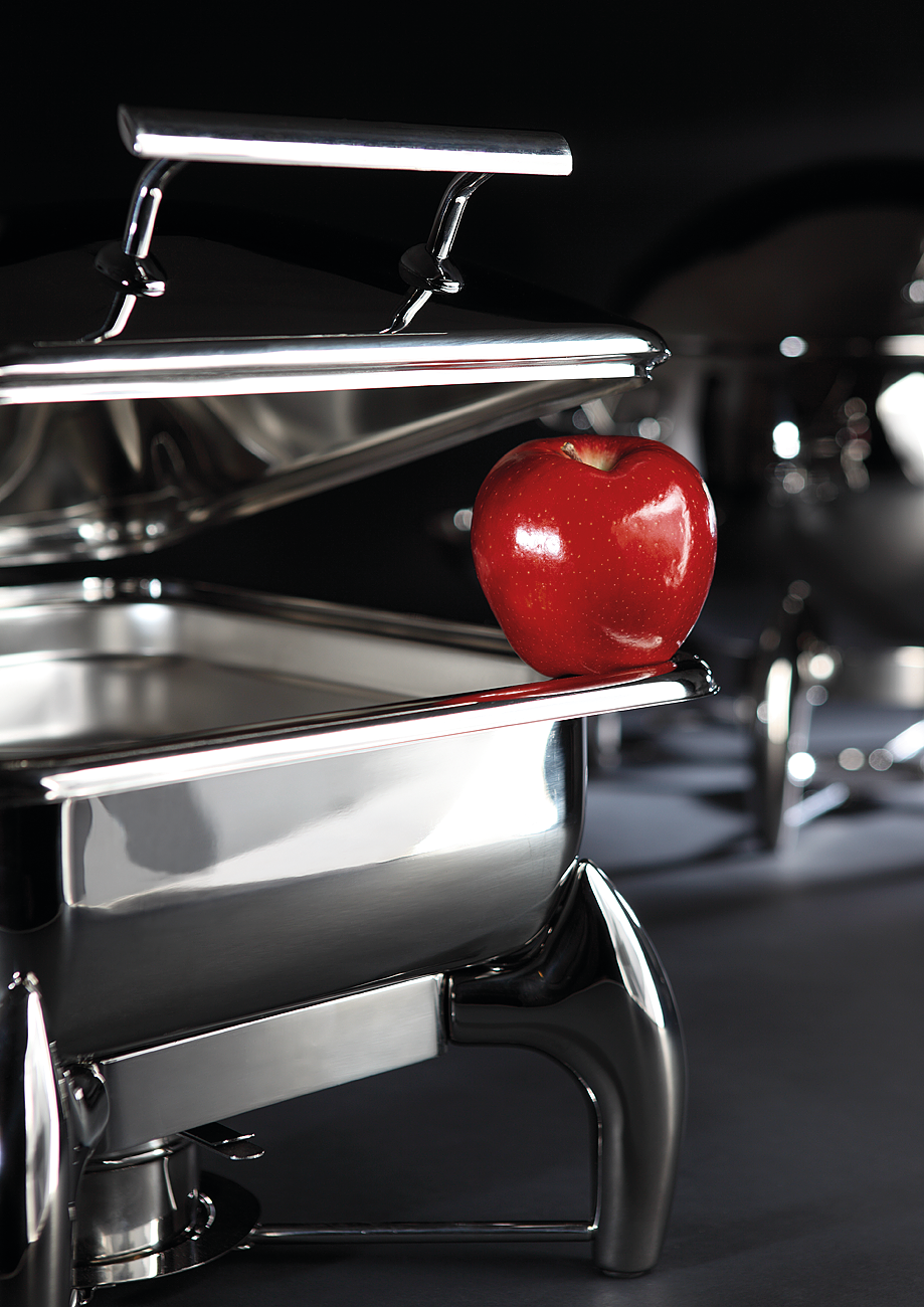 Inox hochglanzpoliert, mit abnehmbarem hydraulischem Edelstahldeckel mit Glasfenster, Sandwichboden sorgt für optimale Wärmeverteilung, für alle Herdarten geeignet, inkl. Gestell, Wasserbecken, GN 1/1-65 Behälter, Löffelablage, 2 Brennpastenbehälter, Metallrahmen für Induktionskochplatte