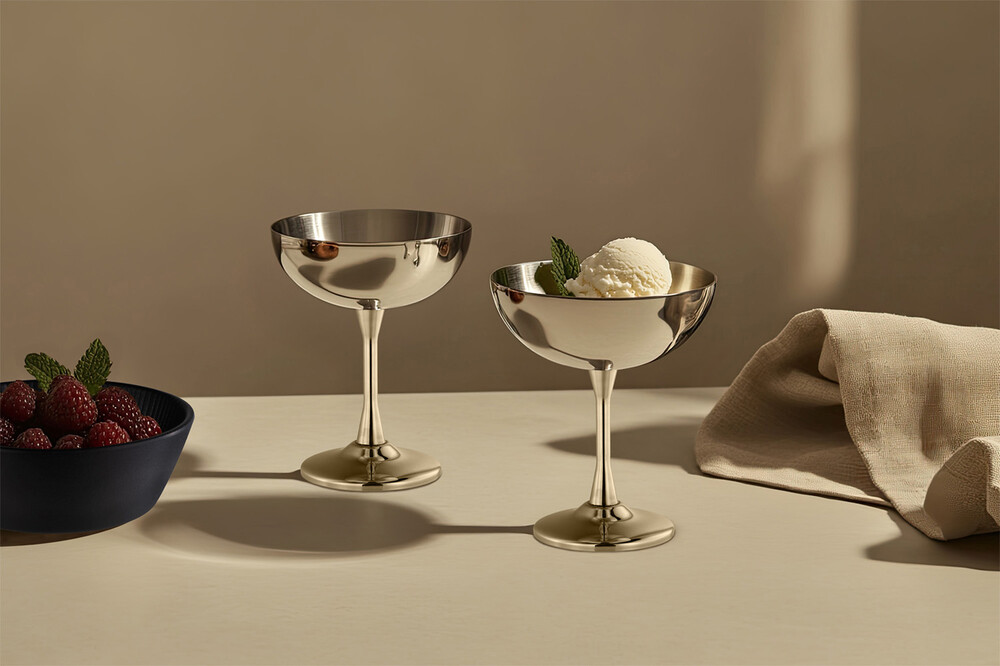 vereint elegantes Design mit praktischer Funktionalität und erinnert an die klassische Dessertkultur vergangener Zeiten. Ideal für Eis, Sorbets oder Desserts – langlebig, hygienisch und spülmaschinengeeignet.