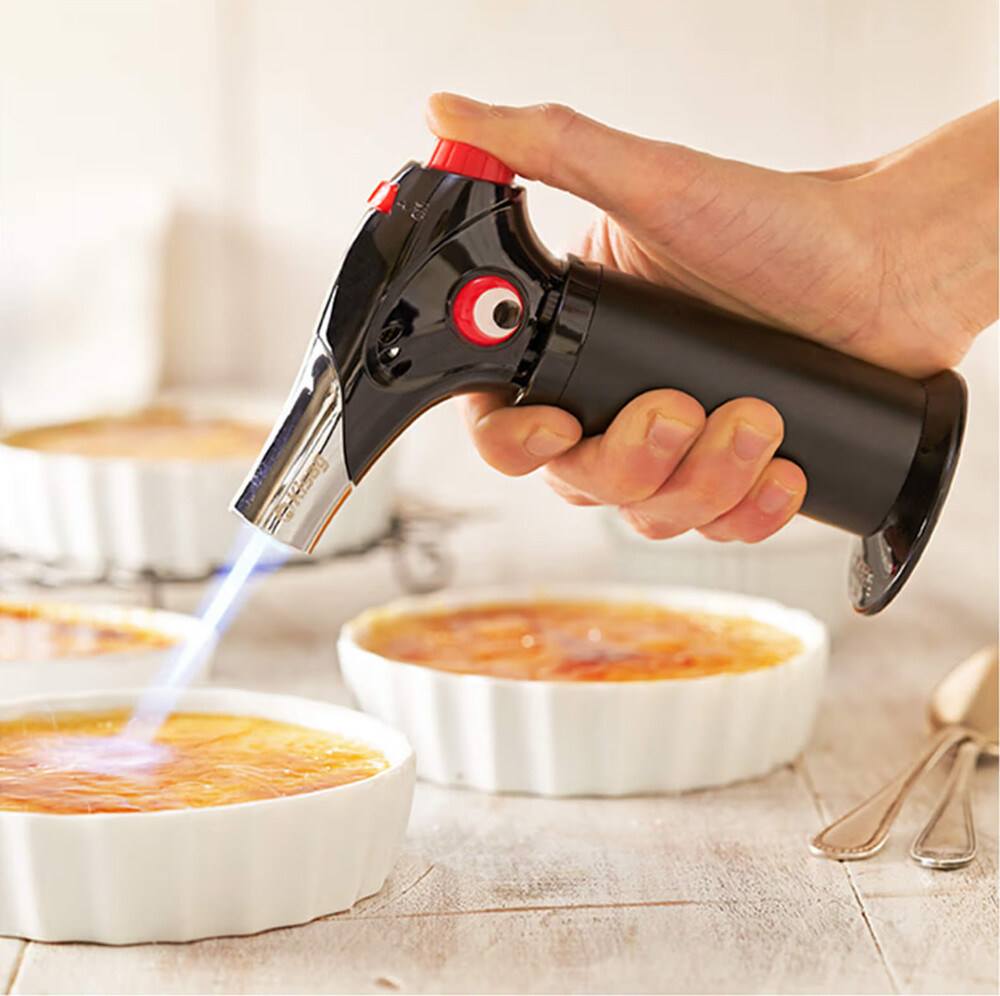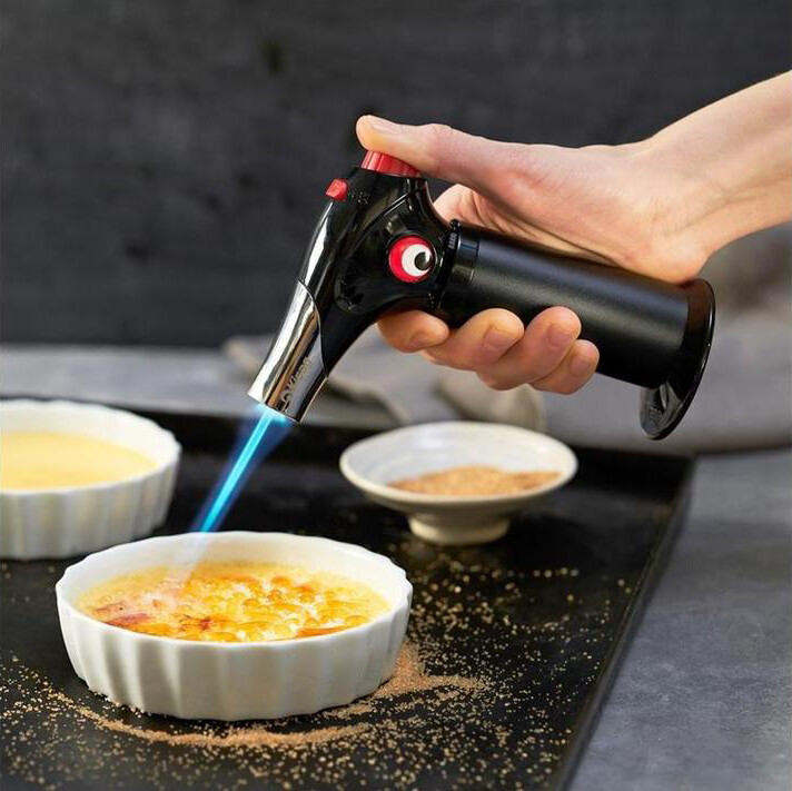 Kraftvoller Leistungsflambierbrenner, stufenlos regulierbare Flamme, mit Einschaltsicherung und Feststelltaste, wiederbefüllbar, bis max. 5 Minuten Dauerbetrieb