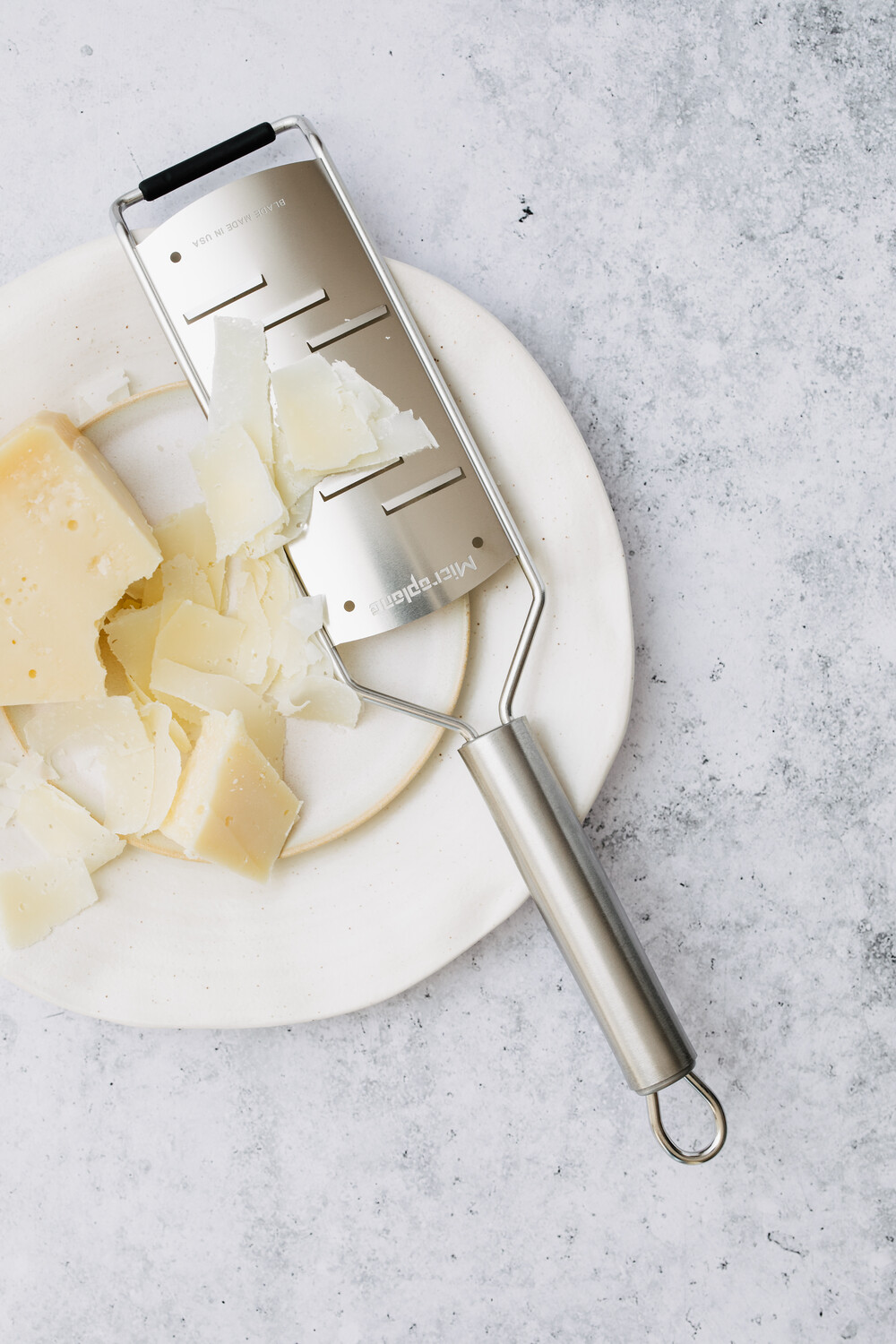 Mit der grossen Raspel und deren sechs länglichen, messerscharfen Klingen können Sie mühelos Schokolade, Karotten, Käse, Trüffel, Butter uvm. in breite Blättchen hobeln.
