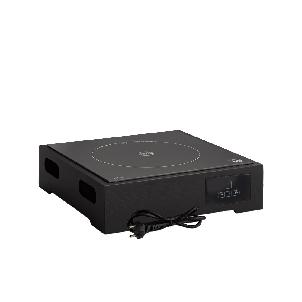 Set, bestehend aus Induktionkochplatte 2000 Watt, inklusive Kabel-Fernbedienung, Leistung in Stufen regelbar, Rahmen aus Eichenholz