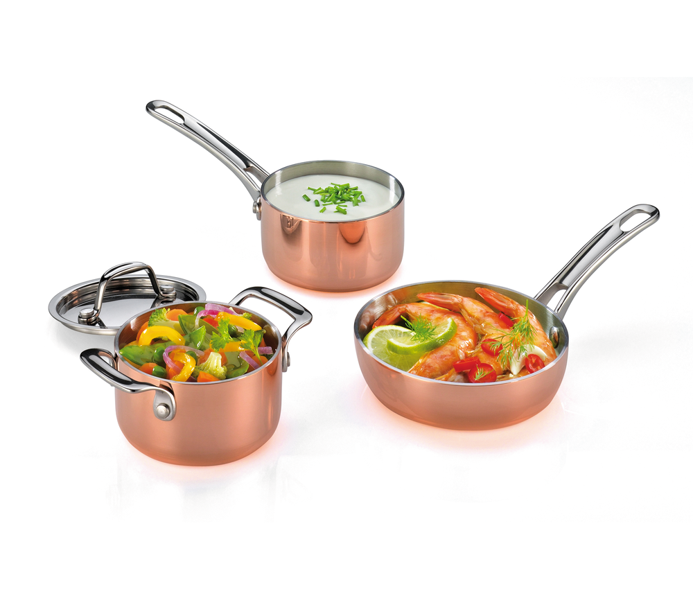 Eine glänzende Idee: Mit der Kupfergeschirr-Serie CULINOX überzeugt Spring mit einem Klassiker aus seinem Sortiment. Aus gutem Grund: Kupfer ist einer der besten Wärmeleiter und wird besonders gleichmässig heiss. Profi-Köche schwören auf das traditionelle Material, wenn sie Risotto oder Polenta zubereiten, Saucen reduzieren oder ein Ragout schmoren. Spring kombiniert die hervorragenden Eigenschaften von Kupfer mit seinem bewährten 5-Lagen-Mehrschichtmaterial, das sekundenschnell auf Temperaturveränderungen reagiert. Für noch schnelleres, punktgenaues Braten und Kochen. Und aussen ist die 0,5 mm starke Kupfer-Lage ein optischer Gewinn. Hochglanzpolierte Edelstahl-Griffbeschläge und Deckel sowie genietete Griffe runden das Bild ab und sprechen für die hohe Qualität der Kochgeschirr-Serie. Damit Sie lange Freude daran haben, empfehlen wir die regelmäßige Reinigung mit dem Spring Kupfer-Reiniger. Die Patina, die sich im Laufe der Zeit bildet, verschwindet und Ihre Töpfe und Pfannen erstrahlen im neuen Glanz.