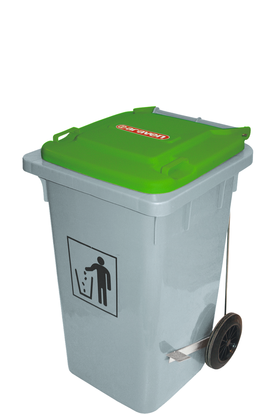 Aus Polyethylen (HDPE), mit Pedal zum vollständigen Öffnen des Deckels, grosse Räder aus Gummi erleichtern den Transport.