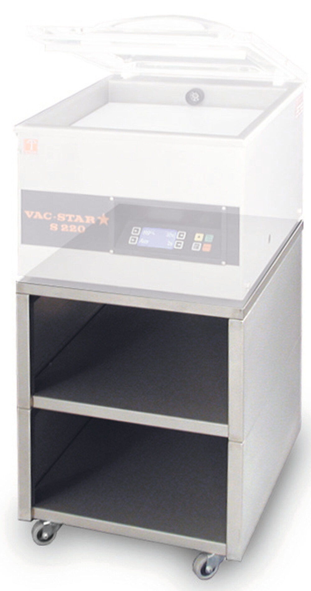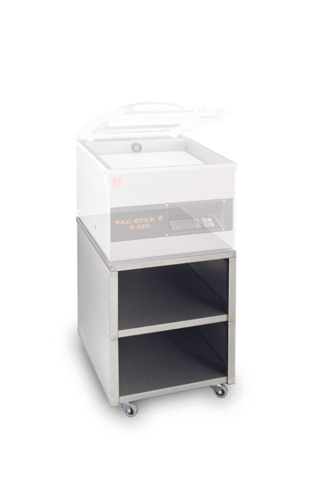 Ein mobile Unterbau - Das ideale Zubehör für Ihre Vakuummaschine für eine ortsunabhängige Verwendung. Komplett in CNS gefertigt. Mit einem Ablagefach und 4 Lenkrollen (davon 2x mit Bremse) ausgestattet.