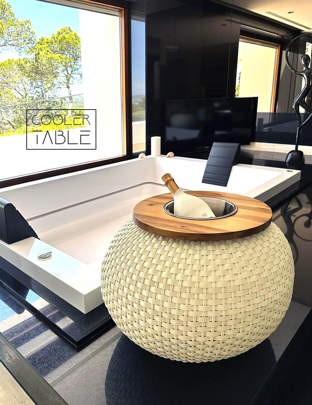 Beistelltisch im geflochtenen, kugelförmigen Design aus Polyrattan. Die Holzplatte aus Akazienholz verbirgt einen cleveren, herausnehmbaren Kühlbehälter, ideal für Wein oder Champagner. Die verstellbare Fusskonstruktion sorgt für Stabilität auf unterschiedlichen Untergründen und macht den Tisch zu einem flexiblen Möbelstück, das sich den Bedürfnissen der Nutzer anpasst.