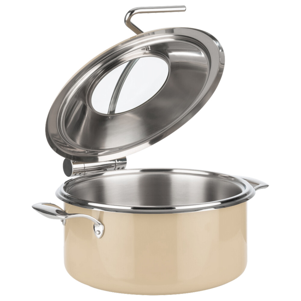Casserole avec fond sandwich pour induction (8 litres), bac (4 litres), couvercle avec fenêtre et système de frein dans le couvercle.