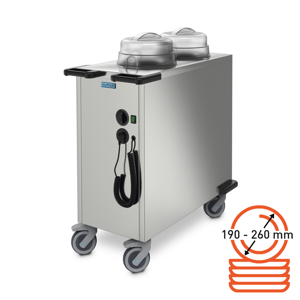 En inox. Beaucoup de détails, comme p.ex. le réglage simple des guides en fonction du diamètre des assiettes, l‘utilisation facile, les piles d‘assiettes hautes et le réglage précis de température (des chariots chauffants statiquement et à chaleur ventilée) clarifient la grande utilité.