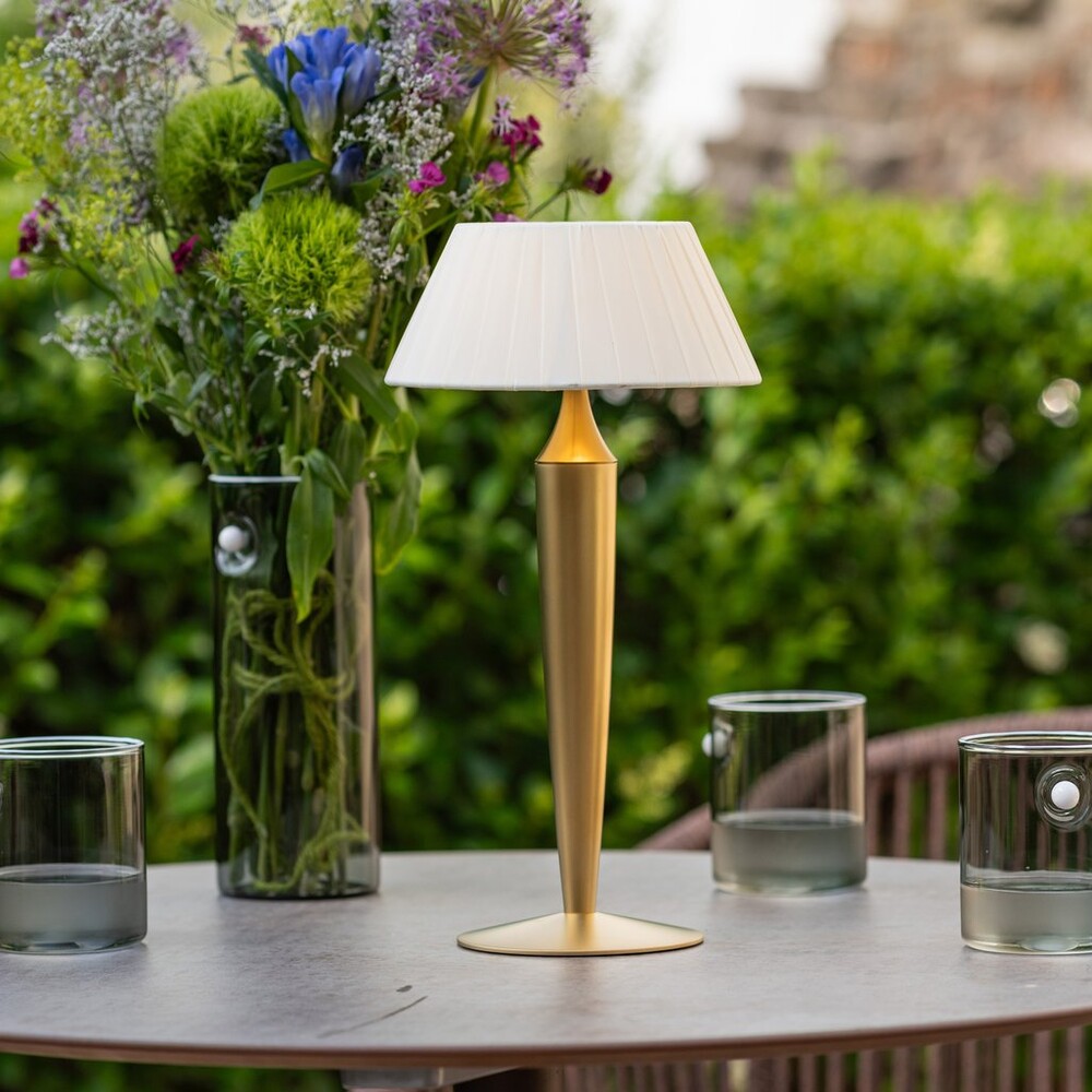 Lampe de table LED portable et rechargeable, alimentée par batterie, avec un abat-jour en tissu plissé. Le module LED est équipé d'une fixation magnétique et peut être facilement détaché, retiré et rechargé sur la station de charge par contact fournie, ce qui rend l'opération rapide et sans effort.