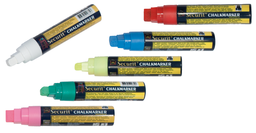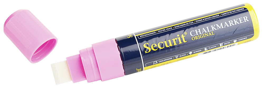 Marqueur à craie liquide pour tableaux et chevalets. Ainsi utilisable sur verre, métal et céramique. Laisser sécher après l'inscription.